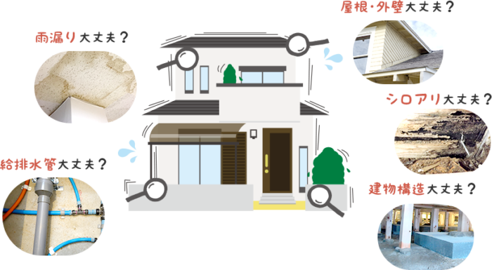 耐震性能の有無/シロアリの被害/構造耐久力や劣化状態/基礎や土台、束の支持状態/断熱材等の状況