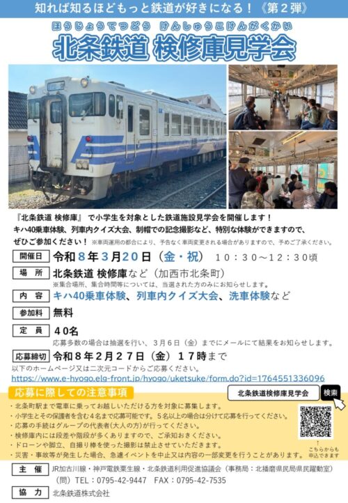 「北条鉄道 検修庫見学会」では、キハ40の乗車体験、列車内でのクイズ大会や制帽を被っての記念撮影、検修庫内の見学などのイベントが開催されます。