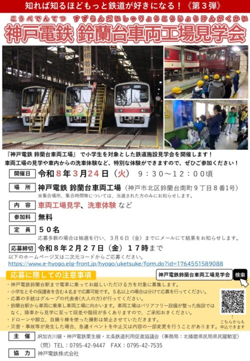 「神戸電鉄 鈴蘭台車両工場見学会」では、車両工場見学や洗車体験、制帽を被っての記念撮影などのイベントが開催されます。