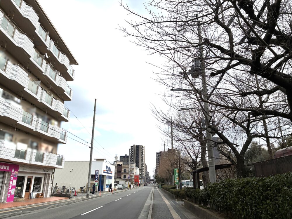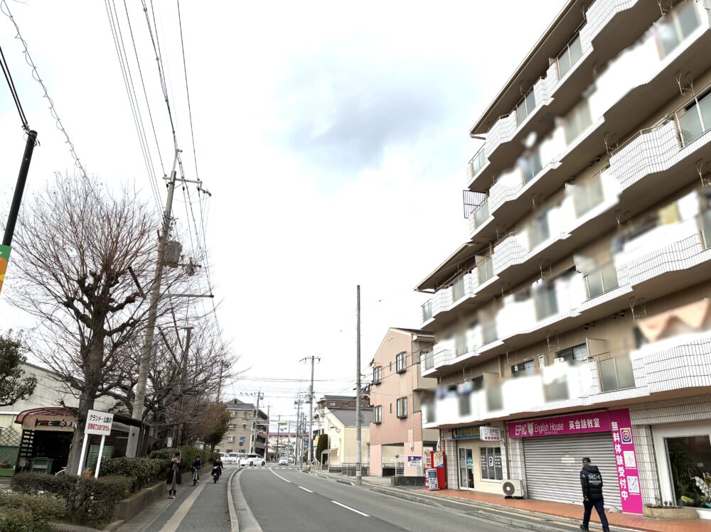 反対を向くとこんな感じ。お隣はピンク色の外観が目を引く英会話教室があります。少し進むと交差点付近には「中谷塾」や「メープル耳鼻咽喉科」などもあるあたり。