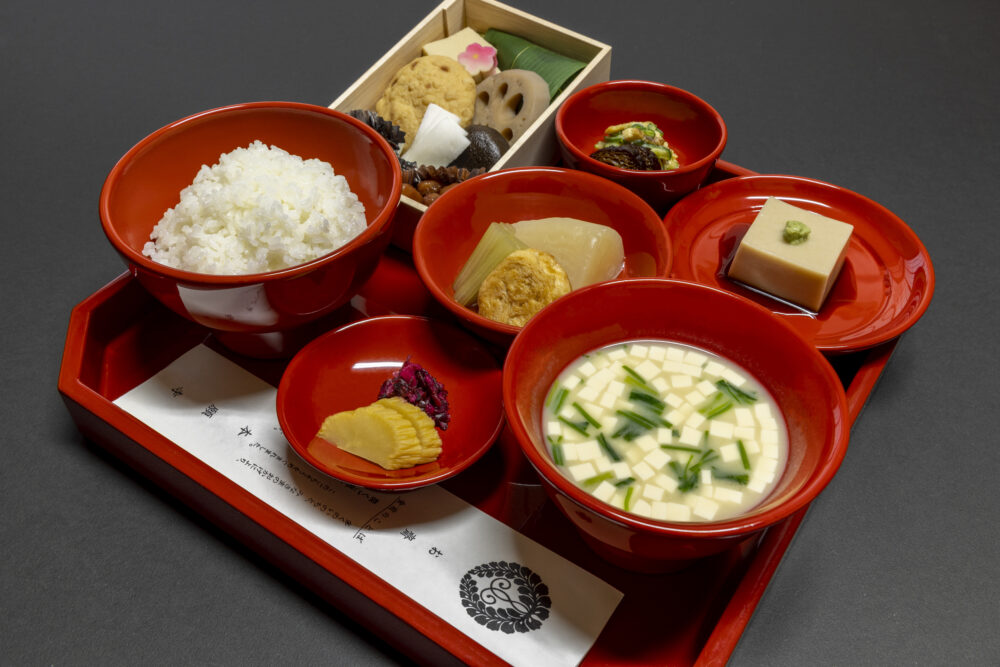 今回のお斎で用意されるのは動物性の食材は一切使わず、一汁五菜を基本とした精進料理。京野菜の聖護院大根や湯葉の炊き合わせ、柴漬けなど京都ならではの料理が楽しめます。