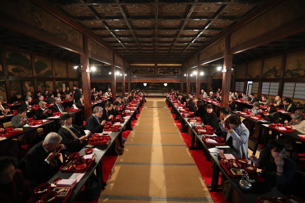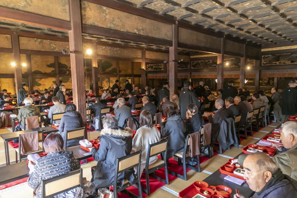 西本願寺では、御正忌報恩講法要(ごしょうきほうおんこうほうよう)という法要を実施するにあたり、国宝・通常非公開の書院「鴻之間(こうのま)」で精進料理をいただく『お斎(おとき)』が開催されています。