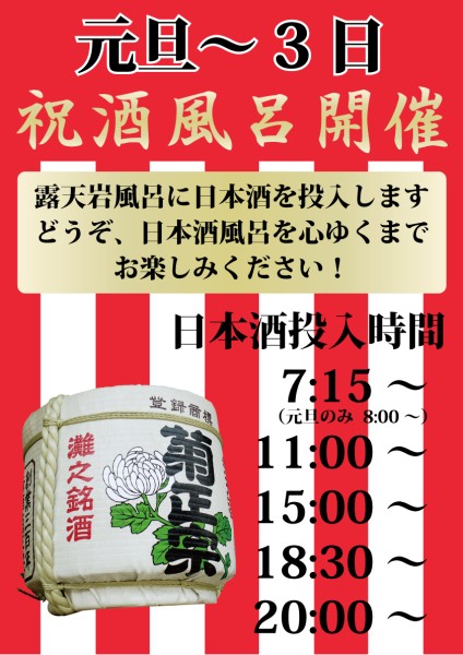 また、年始には色んな企画が予定されているみたい。1月1日(木)~3日(土)は露天岩風呂に日本酒が投入され、「祝酒風呂」が楽しめます。