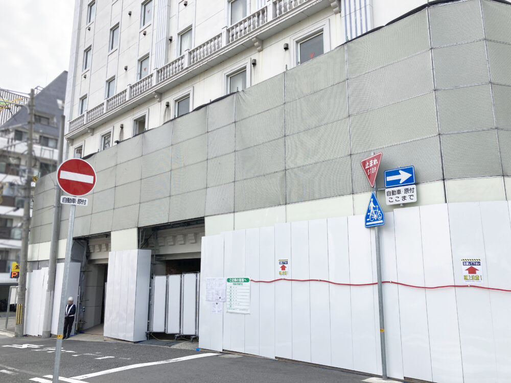 12月中旬、内装の解体工事が行われていて、工事用のパネルで覆われ始めています。工事はおよそ8ヶ月「2026年7月末」までの予定です。