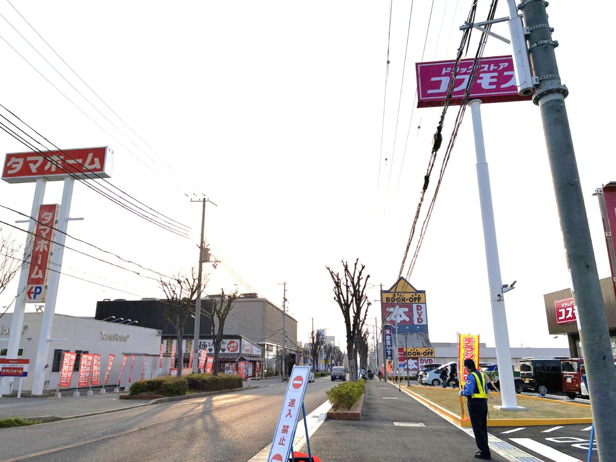 反対を向くとこんな感じ。向かい側には「タマホーム」などがあります。少し進むと「やまや」や「すき家」などがあるあたり。さらに進むと「はま寿司」などもあります。