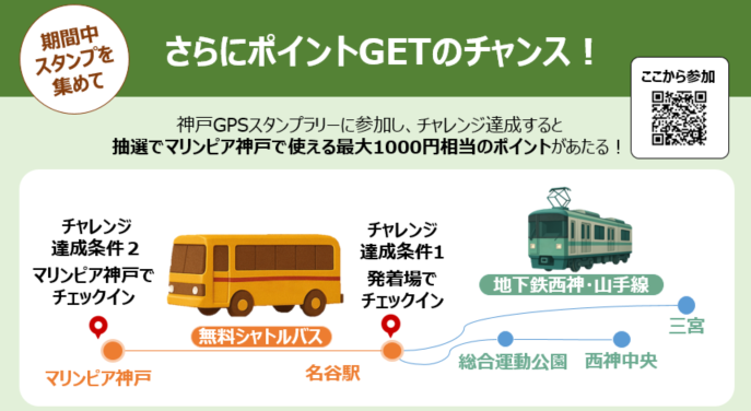特別シャトルバスの運行期間中(12月7~31日)は、たった1回のチャレンジで最大1000円分のポイントがもらえるチャレンジもあるので、神戸市民は参加する価値ありですよ。