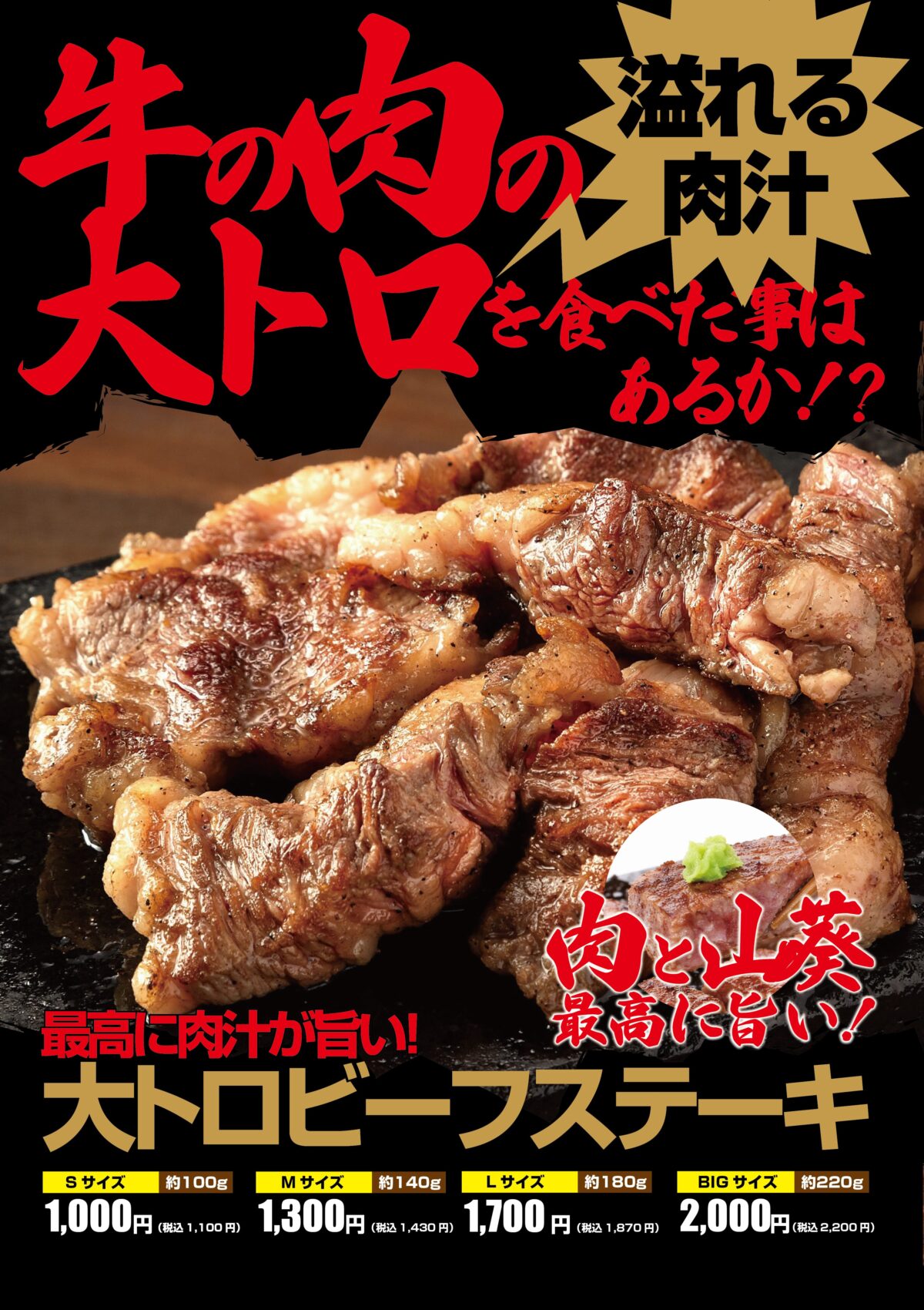 1,000円ステーキに新しく「大トロビーフステーキ」が追加されます。