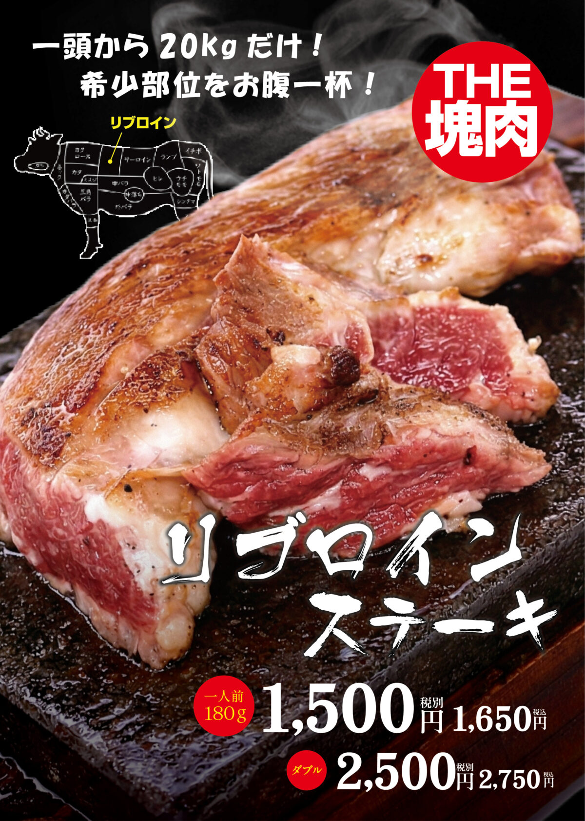 希少部位の「リブロインステーキ」もメニューに登場します。こちらは1,500円から。
