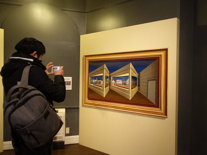 左側から見ると、建物が揺れ動いて、右側の窓の方が大きく見えるようになりました。この絵は左右だけでなく、上下にも建物が揺れ動きます。