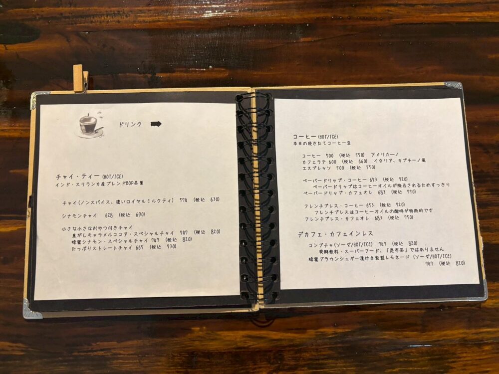 チャイやコーヒーなどのドリンクに加え、スイーツは5種類のスコーンやケーキも味わえます。カレーやグラタンなどの軽食メニューもそろっていますよ。