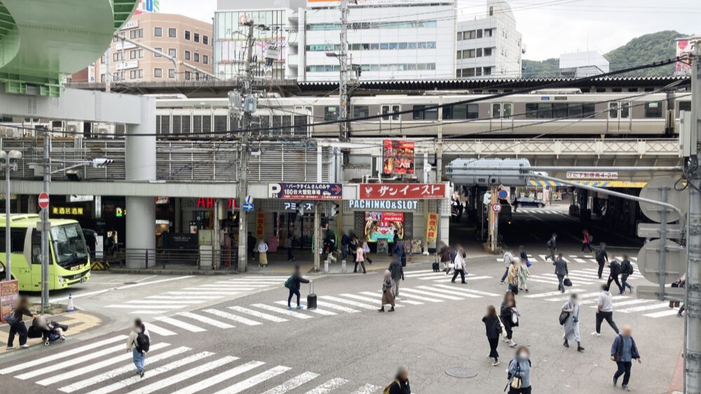東へ行くと「中央図書館」や「神戸文化ホール」、ラーメン店「もっこす総本店」があり、西へ行くと「荒田公園」や「東山商店街」がある方向です。
