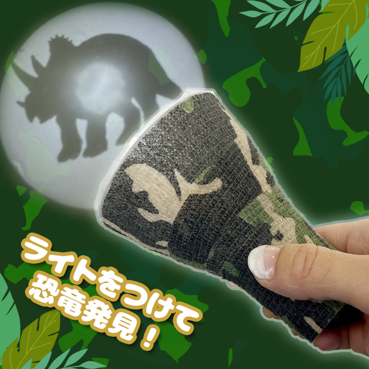 懐中電灯型のライトをつくって、好きな恐竜のシートを貼りつけよう!ライトをつけると暗闇の中に恐竜の影が出現するよ。