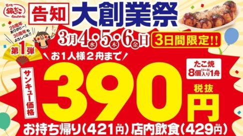 創業以来人気No.1だという「ぜったいうまい!!たこ焼(ソース、8個入り)」が、サンキュー価格(税抜390円/税込421円)で提供されます。※税込価格は持ち帰りの税率・価格(店内飲食の場合は、税率・価格が異なる)