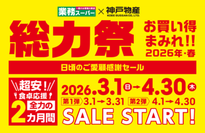 全国の業務スーパーで、2か月間の「春セール」が開催されてます。「超安!食卓応援」ということで、海外直輸入の商品や、オリジナルの国内関連工場商品など、お買い得アイテムを多数ラインナップ。