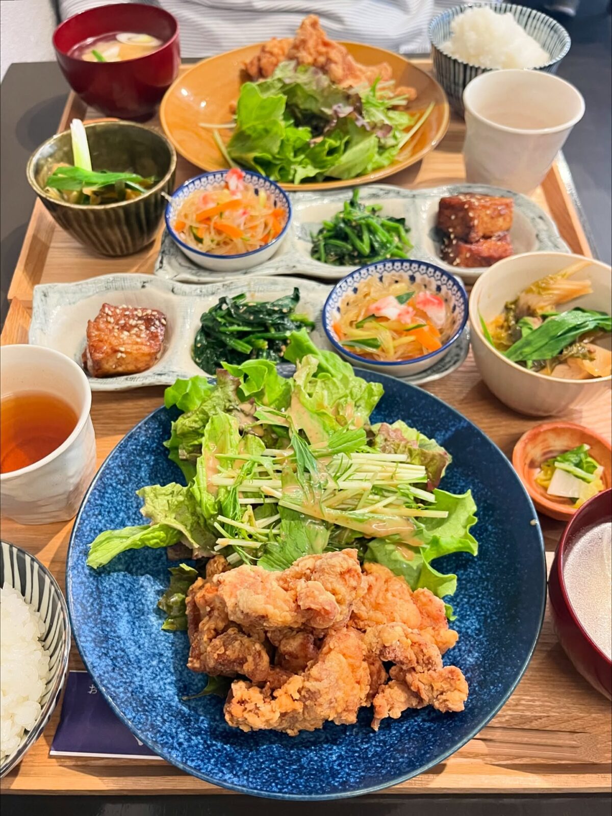 ランチは、「からあげ」もしくは「焼き魚(日替わり)」からメインを選ぶことができます。どちらも、日替わりおばんざい4種、ごはん、お味噌汁、香物がついてきて1,350円。