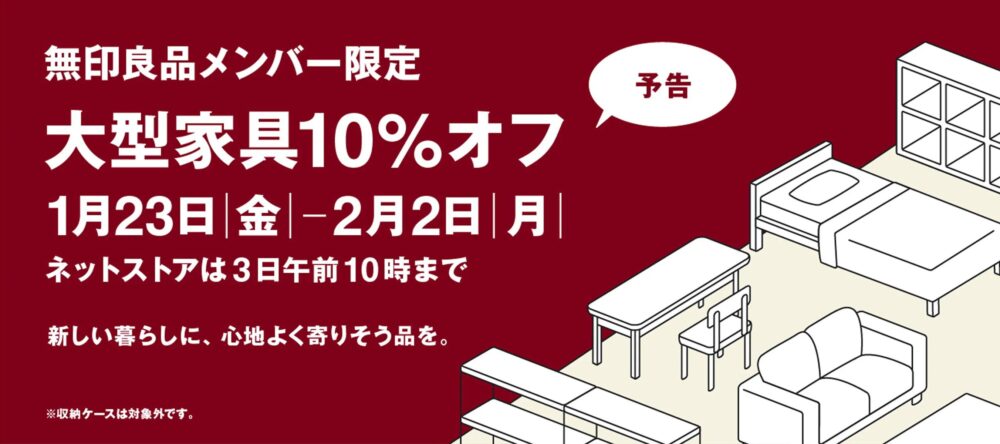 無印良品メンバーを対象に、対象の大型家具(一部商品除く)が10%オフとなるキャンペーンです。
