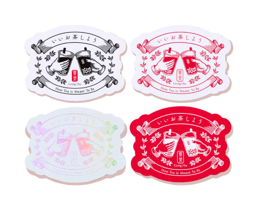 いちご杏仁 ミルクティー/アーモンドミルクティー/ジェラッティーのいずれかを購入すると、「いいお茶しよう」をテーマにした、オリジナルデザインのステッカーをランダムで1枚もらえます。デザインは4種類です。