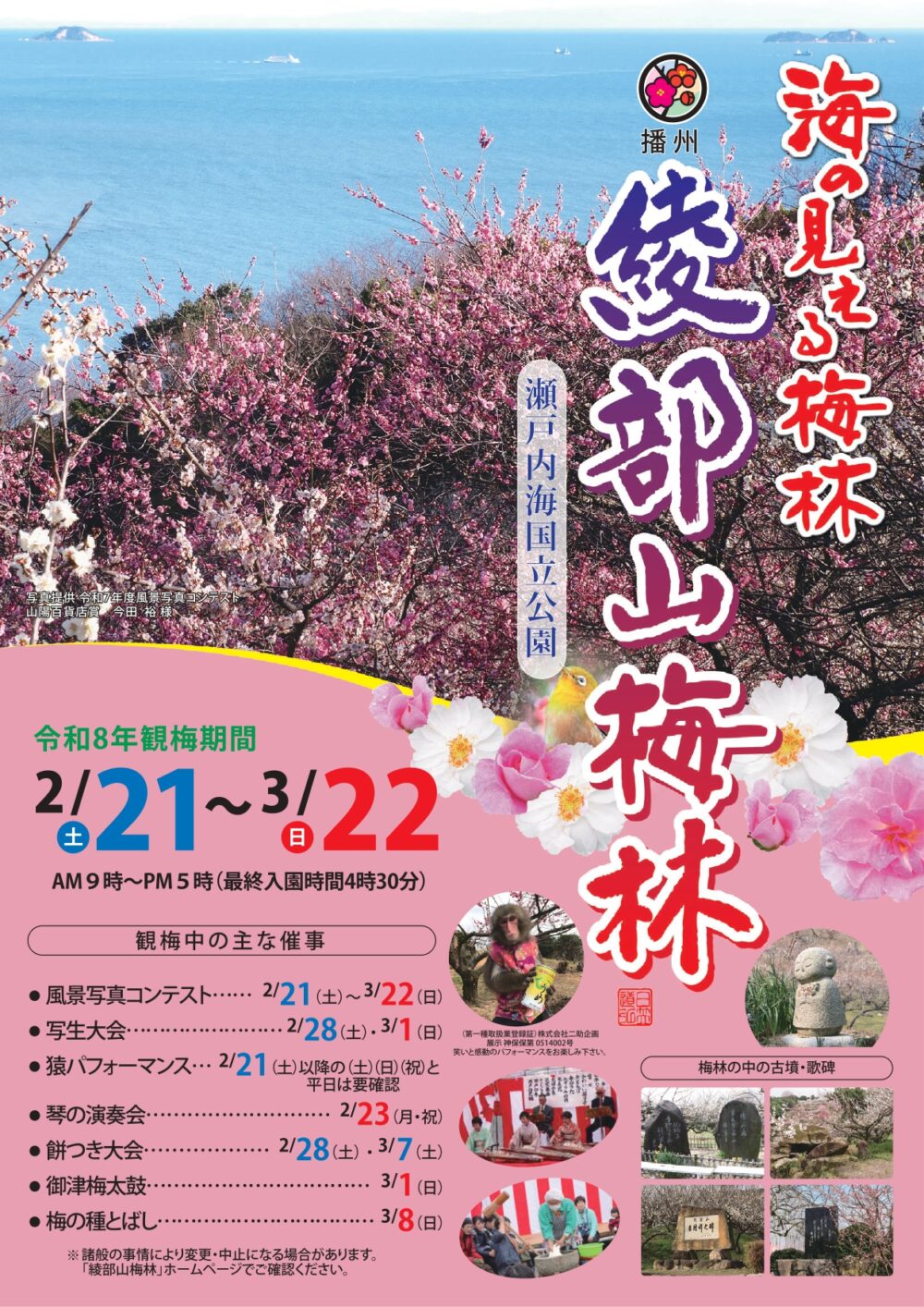 期間中は、「風景写真コンテスト(2月21日~3月22日)」や「写生大会(2月28日・ 3月1日」「猿まわし(2月21日)」「琴の演奏会(2月23日)」「餅つき大会(2月28日・3月7日)」などのイベントも予定されています。