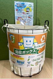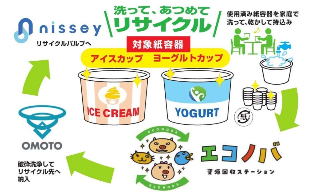 実施されるのは「ふたば」と「あづま」の2拠点。対象はアイスクリームおよびヨーグルトで使用される紙製食品容器で、中身を空にして、家庭で洗浄・乾燥したうえで「エコノバ」まで持っていき、専用ボックスで回収します。