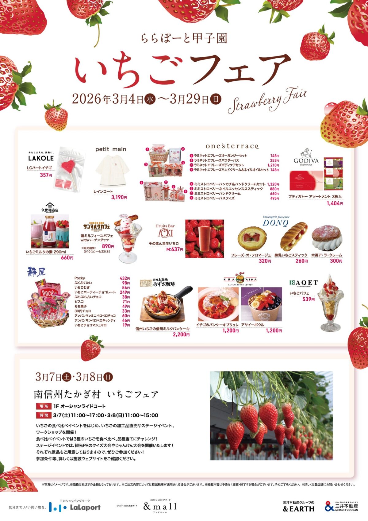 ららぽーと甲子園では、3月29日(日)まで「いちごフェア」も開催中です。いちごを使ったスイーツや、いちごをあしらったグッズが登場してます。