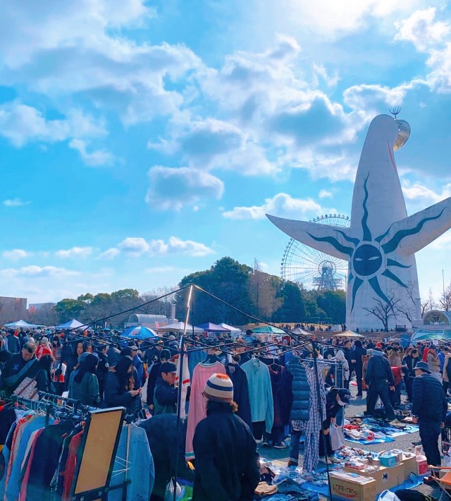 万博記念公園内の「お祭り広場」に、古着、手作りアクセサリー、ヴィンテージ雑貨、ハンドメイド品など様々な商品が並びます。