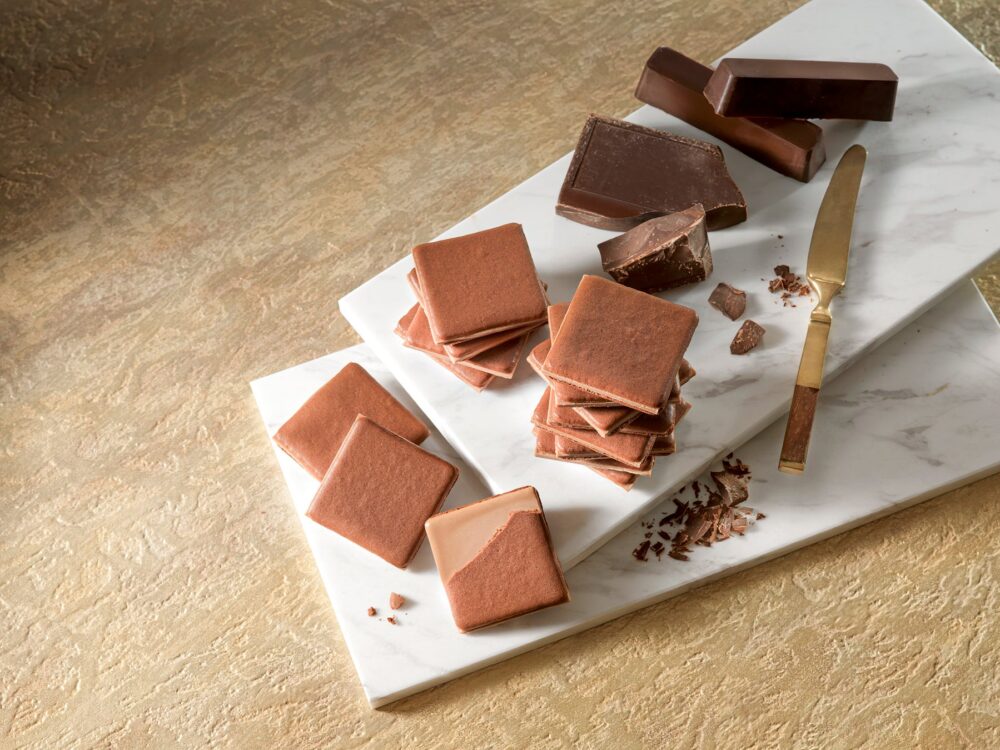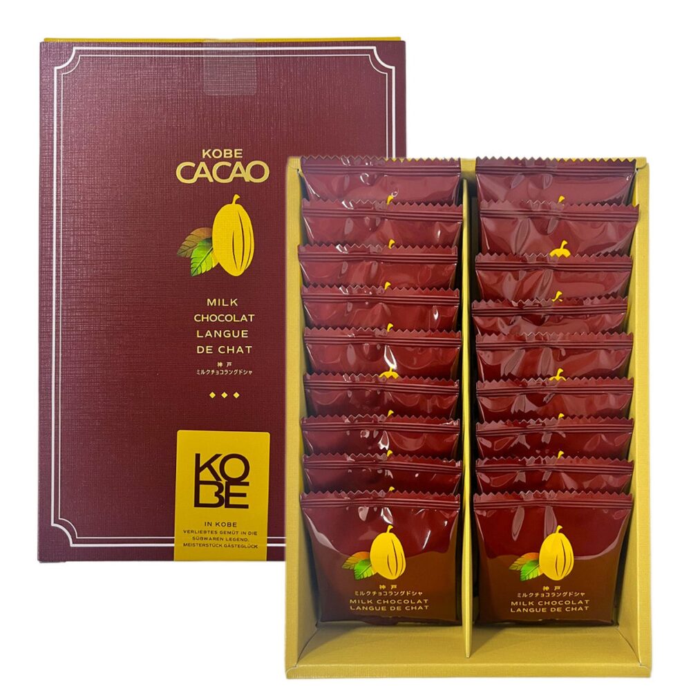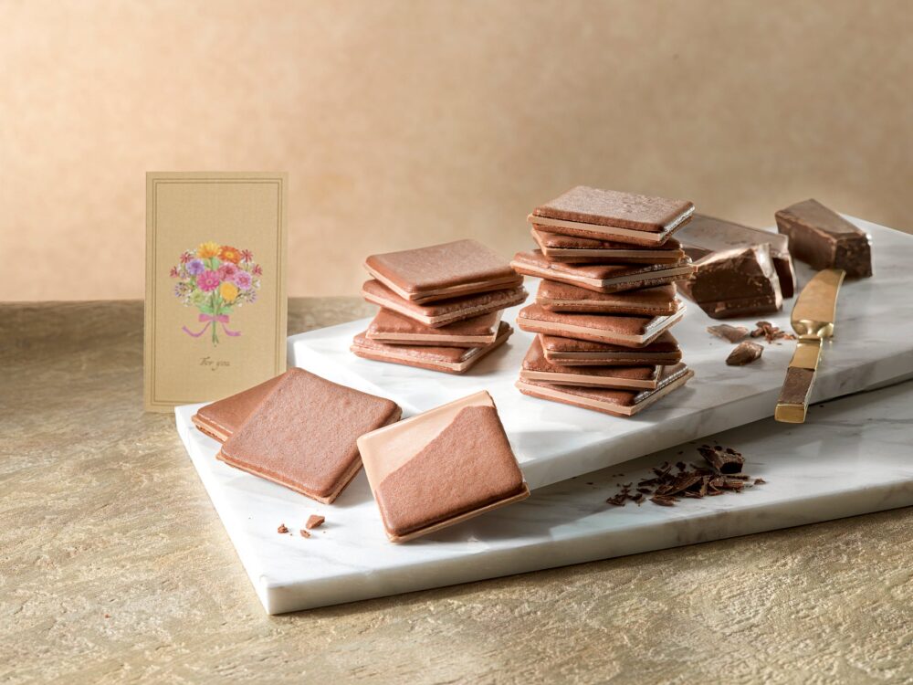 「神戸ミルクチョコラングドシャ」は、まろやかな口溶けのミルクチョコプレートをココア生地のクッキーではさんだ、さっくりと軽やかなラングドシャ。