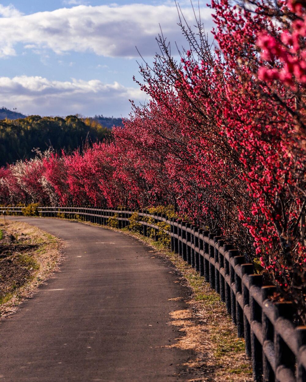 並木道を散歩しながら、緩やかにカーブする道の先を見れば、梅が並んでいる風景を楽しめます。