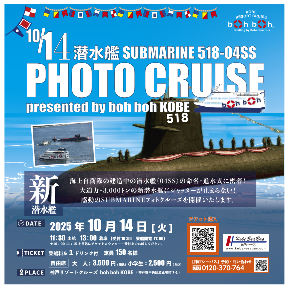 神戸シーバスboh boh KOBEから、「潜水艦「艦番号518-」命名・進水式」にあわせて、迫力満点の海上自衛隊 潜水艦を間近で撮影できるイベントが開催されます。