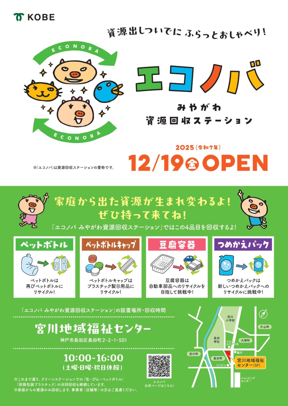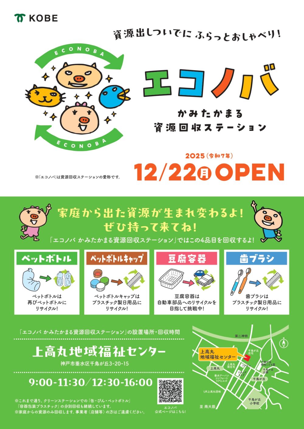 プラスチックのリサイクルと、地域交流の場づくりを目的とした、『エコノバ』(資源回収ステーション)が長田区と垂水区にオープンします。