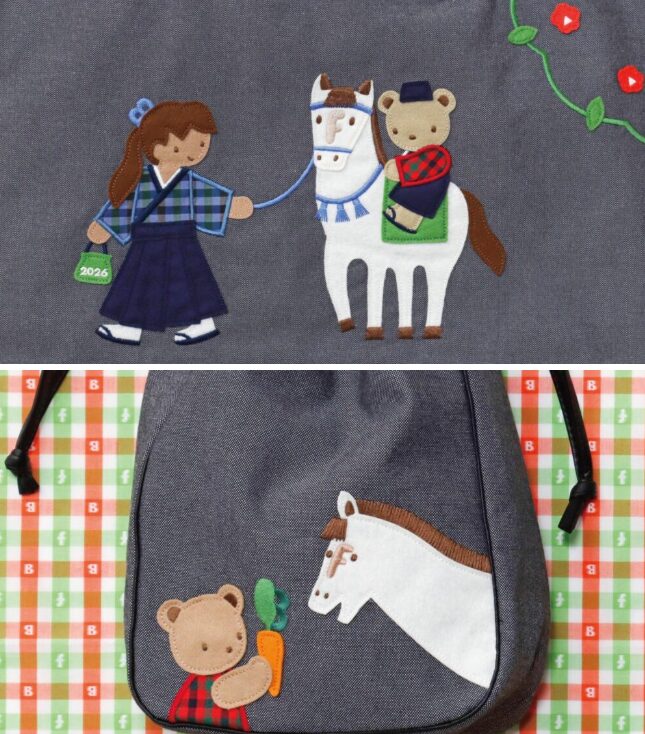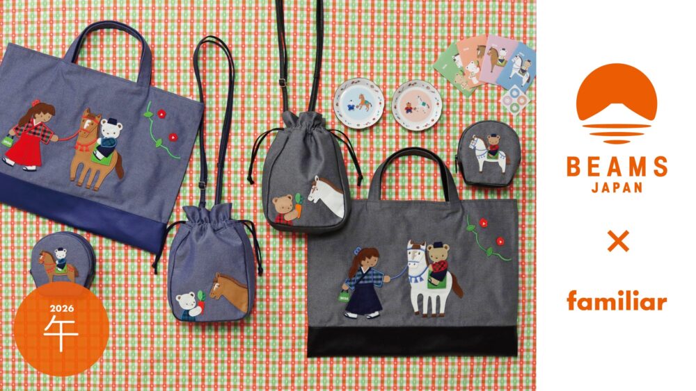 2021年からスタートしたファミリアとビームスの干支コラボ。第6弾となる今年は、2026年の干支「午」をモチーフに、和装で馬に乗るクマちゃんや手綱を持つ女の子をデザインに取り入れた「デニムバッグ」「ショルダーバッグ」「ポーチ」のラインナップです。