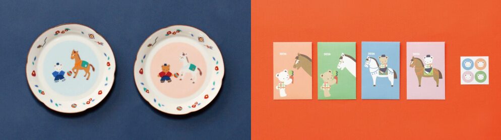 また、両社販売アイテムとして、BEAMS JAPAN×familiarのコラボアートとリンクした「ポチ袋」と「小皿セット」が登場。小皿には馬とクマちゃんが楽しそうにまりであそんでいるモチーフと、ふちには的や矢、コマなどお正月らしいモチーフがあしらわれています。色違いの2枚セットで、それぞれ違った表情を楽しむことも。