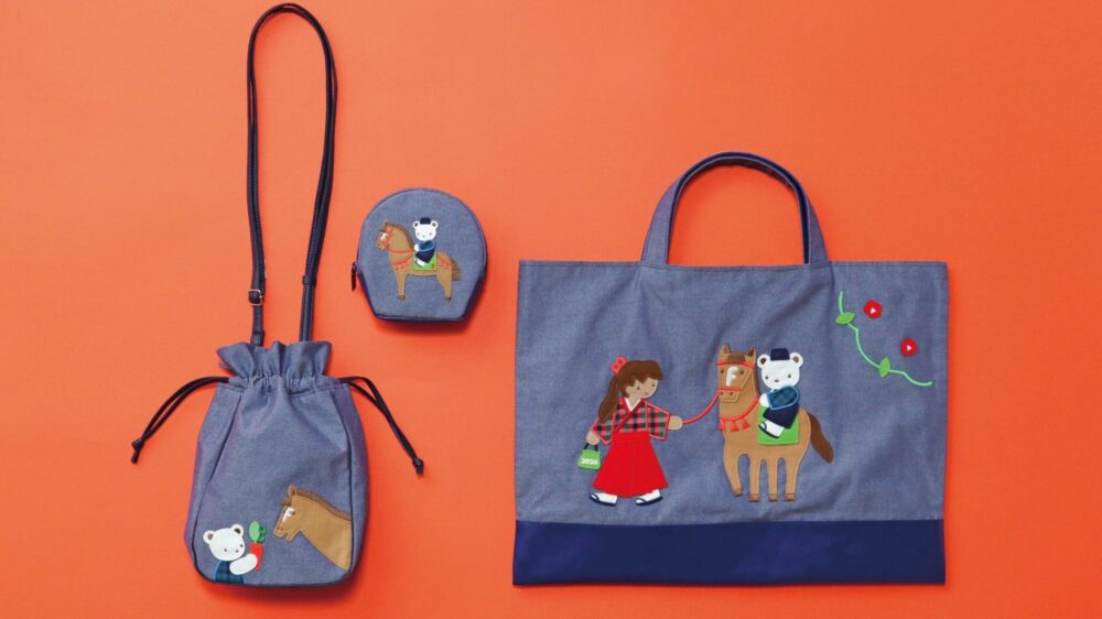 デニムバッグとポーチは、日本の伝統的な武術「やぶさめ」からインスピレーションを受けています。伝統的な馬具を身に着けた馬に乗るクマちゃんと手綱を持った女の子を和装で表現。女の子とクマちゃんの服にファミリアオリジナルのチェック柄が使用されています。