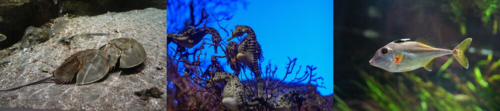 身体の形が蹄鉄に似ていることから英名でHorseshoe crab(ホースシュークラブ)と呼ばれる“カブトガニ”や、前方に突き出した小さな口と頭部の特徴的な形が馬の頭部を連想させる“ギマ”などなど。