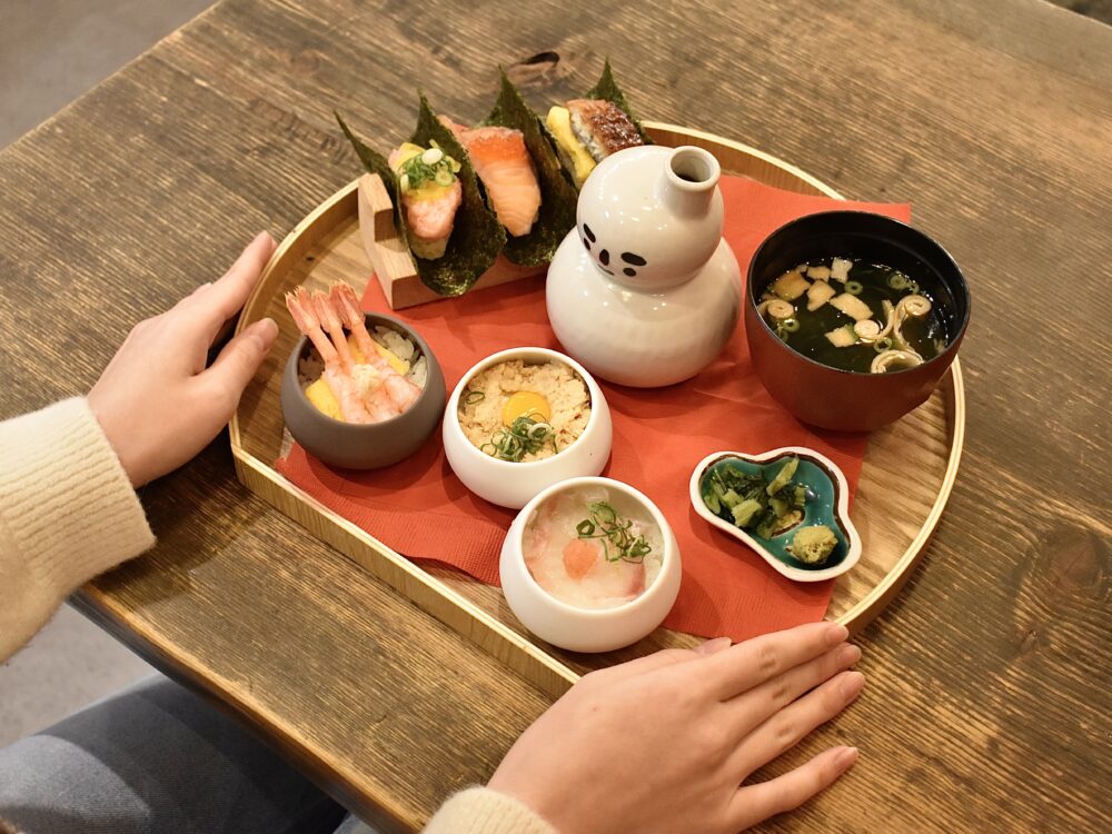 やってきました、「おちょこ丼 & 手巻き6種セット (1,738円) 」です。お盆に乗ったおちょこ丼と手巻きが、とてもかわいく映えますね。