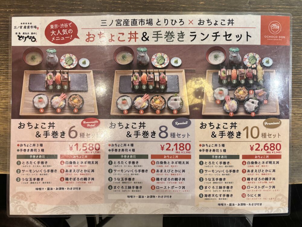 「おちょこ丼 & 手巻きランチセット」のメニューは、6種/8種/10種と品数を選べますが、その中の「6種セット」だとなんと 1000円台で注文することができます。