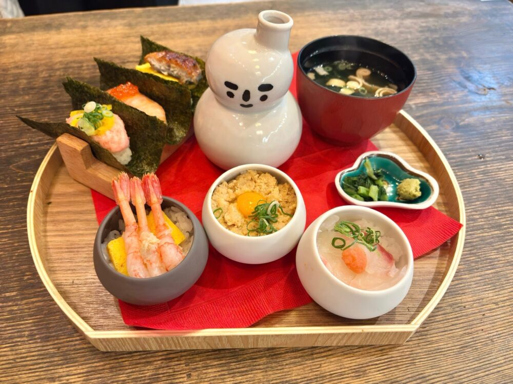 種類は、おちょこ丼が「白身魚とネギ明太丼」「あまえびとかに丼」「鶏そぼろの親子丼」、手巻きが「とろたく手巻き」「サーモンいくら手巻き」「うな玉手巻き」とのこと。