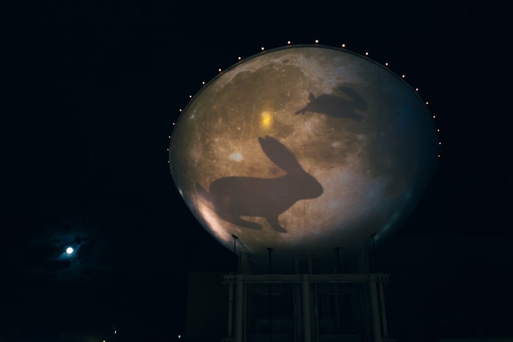 巨大なフルムーンを投影。定期的に花火が上がったり、うさぎが飛び跳ねたりする演出を施します。