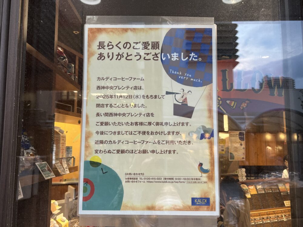 地下鉄 西神中央駅すぐの「プレンティ西神中央」にある『KALDI(カルディ)』が、11月12日(水)をもって閉店するそうです。