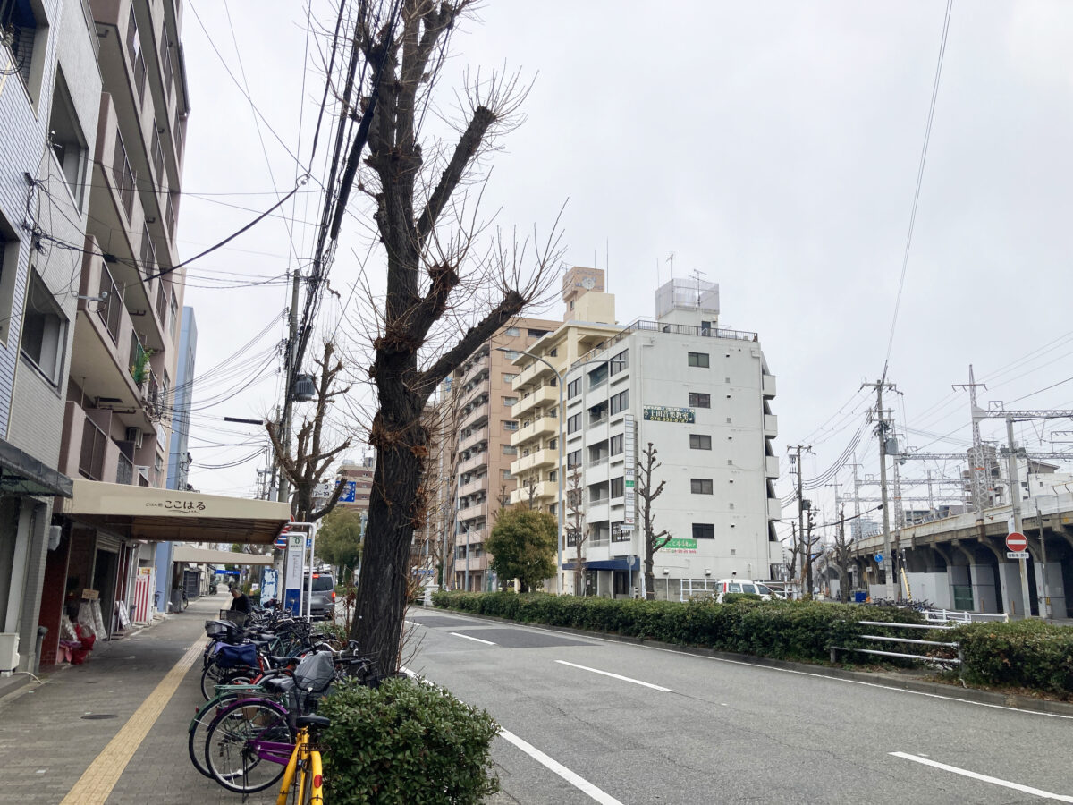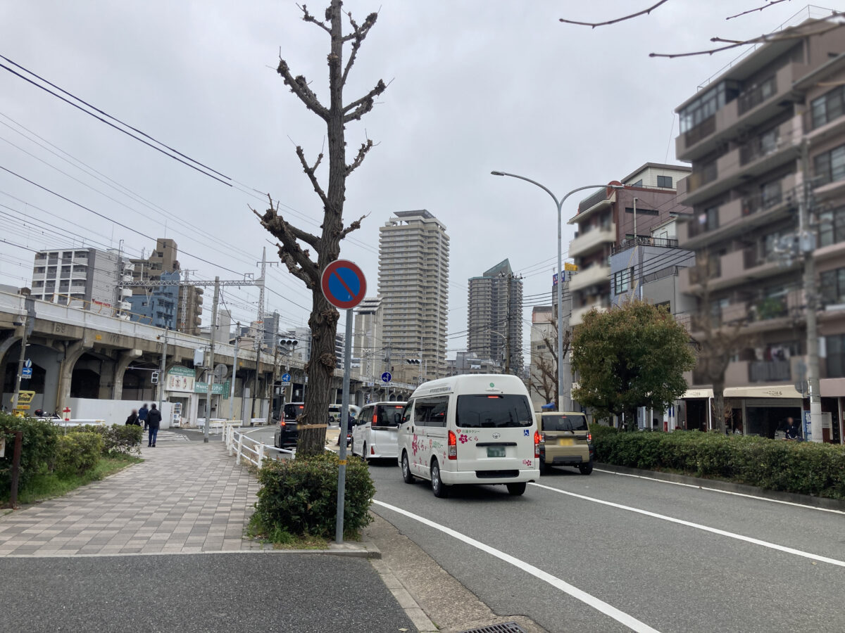 お店の目の前に市バスのバス停「柳原」があって、目の前の道をまっすぐ東へ行くと「新開地」駅の方へ行き着きます。