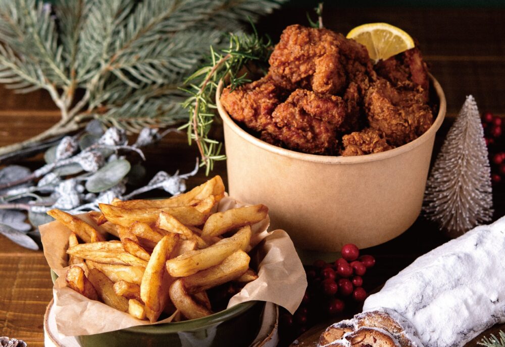 バターミルクに漬け込みジューシーに揚げたフライドチキン。10ピース、8ピース、6ピースの3サイズが用意されていて、クリスマスパーティーにぴったりの「フライドポテトコンボ」もあります。