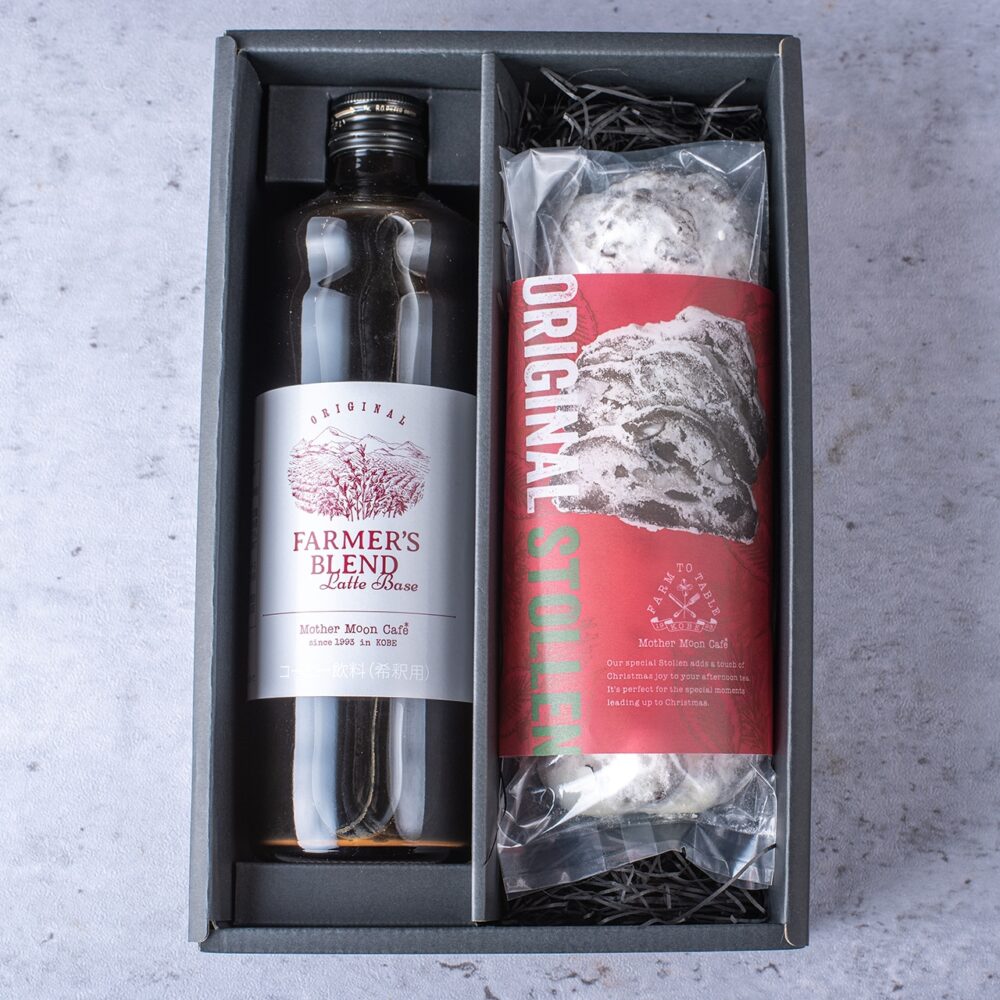 マザームーンカフェこだわりのカフェラテを、ミルクで割るだけで簡単に楽しめる「カフェラテベース」とセットになった「クリスマスギフトセット」もあります。