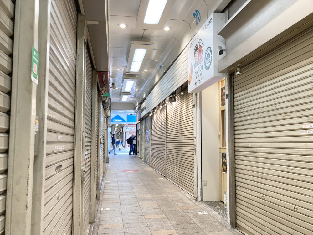 「ピアザ神戸2」の通路側から見ると、外より間口が狭く見えます。東を向くと生田ロードとの交差点で、角には「KOBE KEBAB (コウベケバブ)」があるところ。