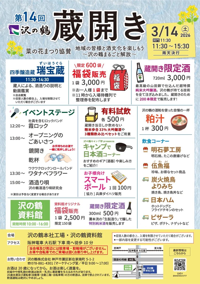 阪神 大石駅から歩いて15分ほどの場所にある「沢の鶴本社工場」で『 蔵開き』が開催されます。