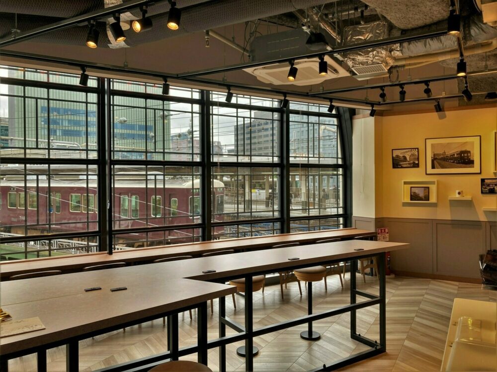 店内の大きな窓からはJRの駅が見えていて、阪急電車が走る姿も間近に見ることができます。電車をじっくり見るために、あえてカウンター席を選ぶ人もいるそうですよ。