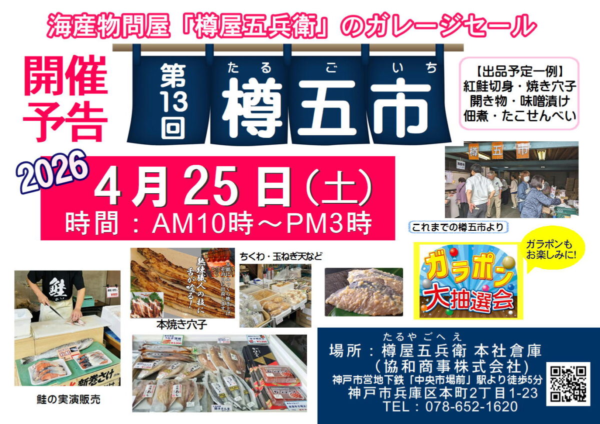 海産物問屋「樽屋五兵衛」の『ガレージセール』が開催されます。
