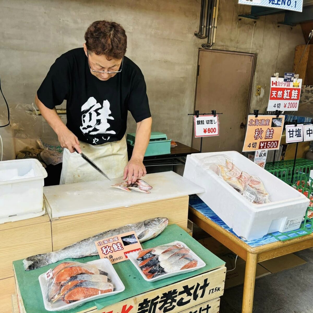 鮭の実演販売をはじめ、なかなか手に入らない商品の特価販売などがあるんだそう。