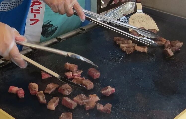 ・黒毛和牛サイコロステーキ、ねぎ塩牛タン焼き、牛すじお好み焼き、かき氷、ドリンク〈帝神志方ミート〉