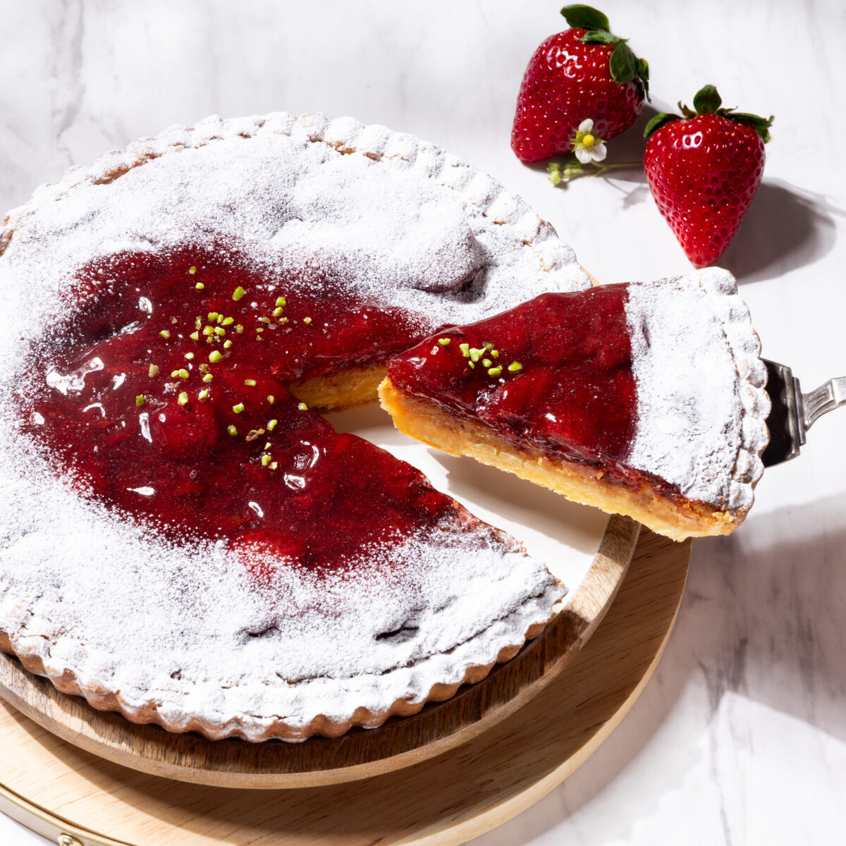 いちご果汁を合わせた風味豊かなアーモンドクリームと、甘酸っぱいいちごの味わいがひろがるタルトです。