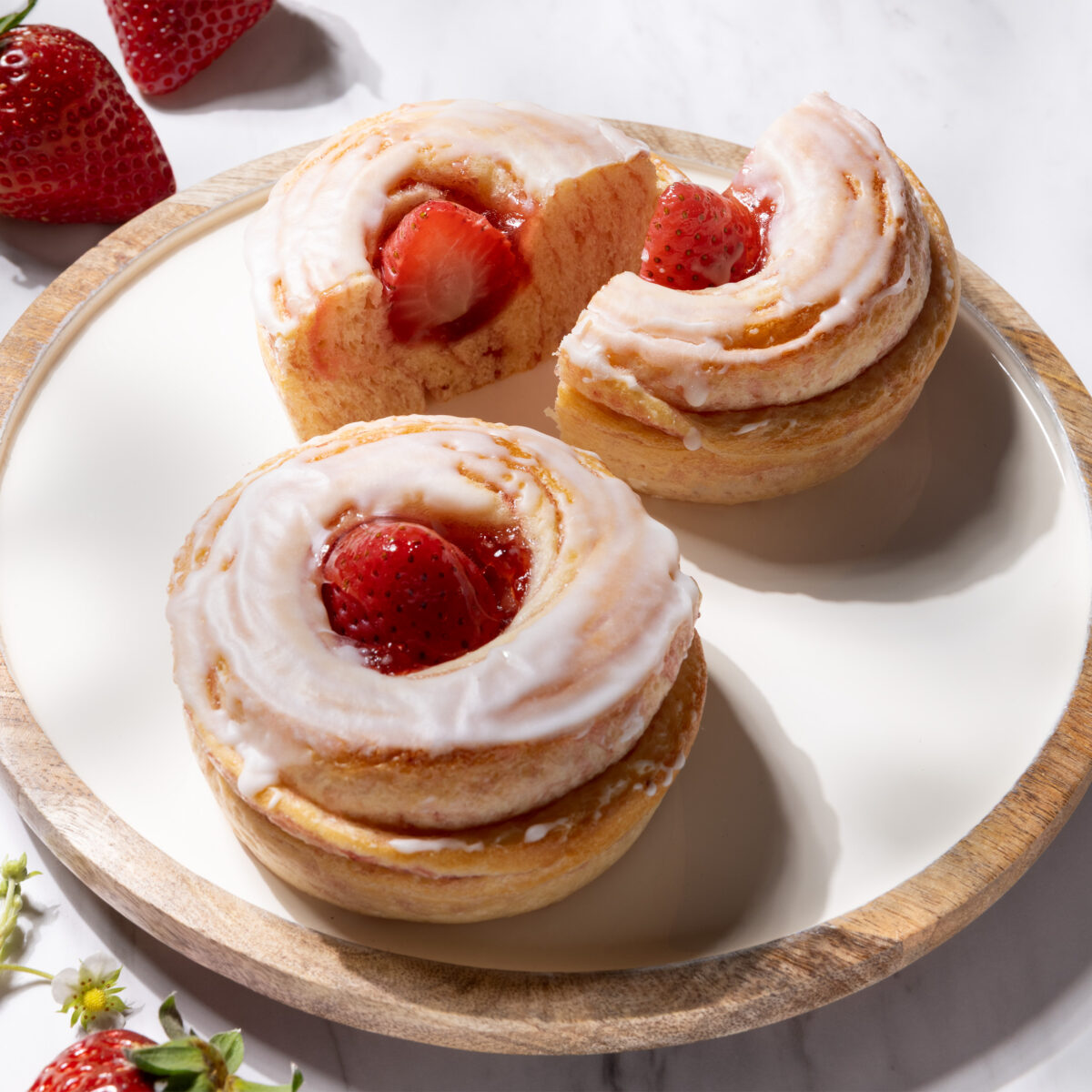 いちごジャムを巻き込んだロールパンにフレッシュのいちごをのせ、練乳入りのアイシングで仕上げられています。