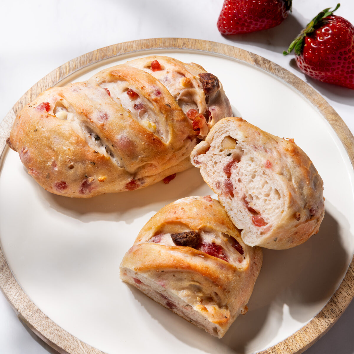 ドライストロベリー、マカダミア、ホワイトチョコの入ったカンパーニュ。ほのかに香るバジルとオリーブオイルがアクセントになっています。